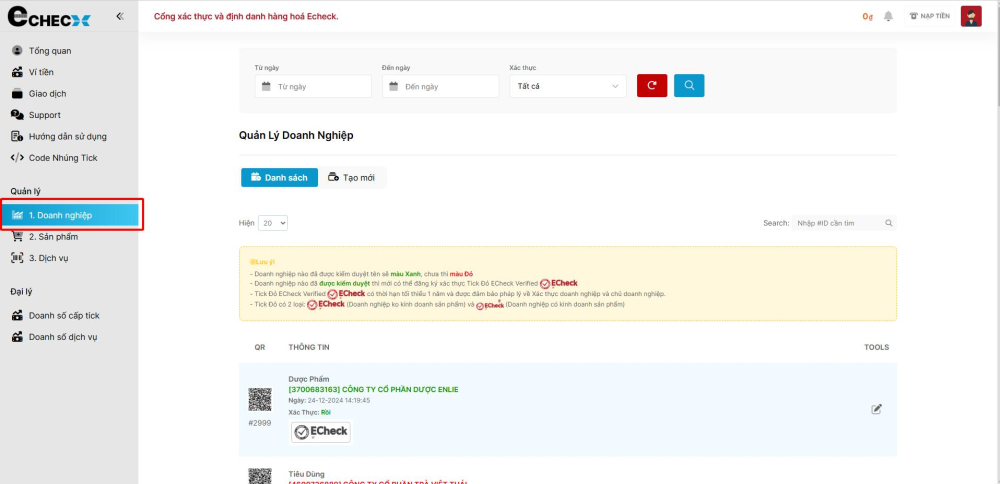 Bước 1: Truy cập trang quản lý doanh nghiệp, và chọn doanh nghiệp
